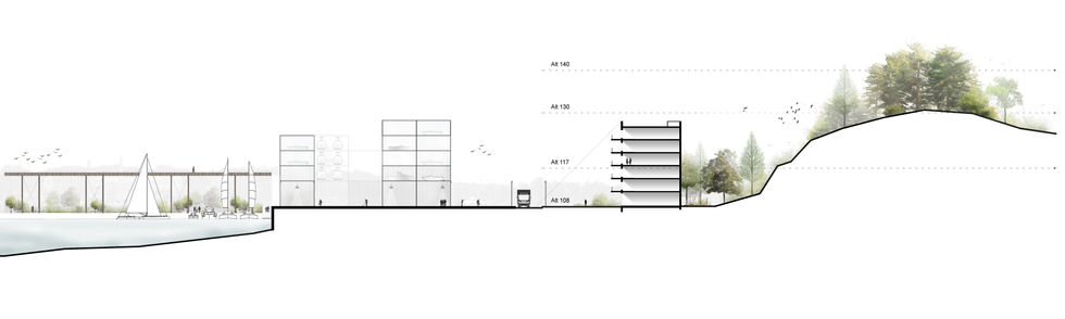 La ville de Karlskrona a préservé sa qualité architecturale grâce à son insularité, elle est reliée à la Suède seulement par une bande de terre. Hattholmen : le site proposé par le concours Europan se situe à l’entrée de la presqu’île, c’est un territoire gagné sur la mer. Face à la montée des eaux, au lieu de construire sur ce site, le projet dessine une limite poreuse, pensées pour être inondables. Le parc et sa réserve ornithologique évolueront en fonction des saisons. Plus haut, les quais abriteront une marina de stockage, des ateliers de rénovation et constructions de bateaux, mais aussi un site de production de maisons flottantes. Derrière ce quai se développera tout un nouveau quartier, ses rues seront en lien avec le Karlskrona historique tandis que dans les îlots, entre les habitats semi-collectifs se développeront places, rues intérieures, potagers, jardins d'enfants...